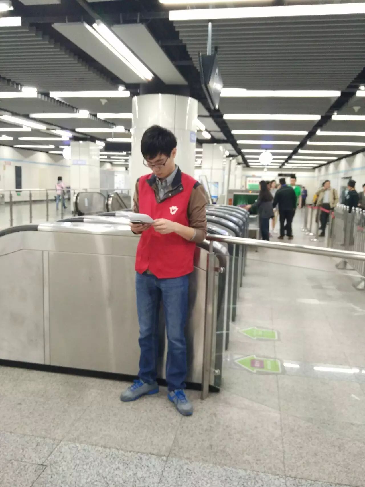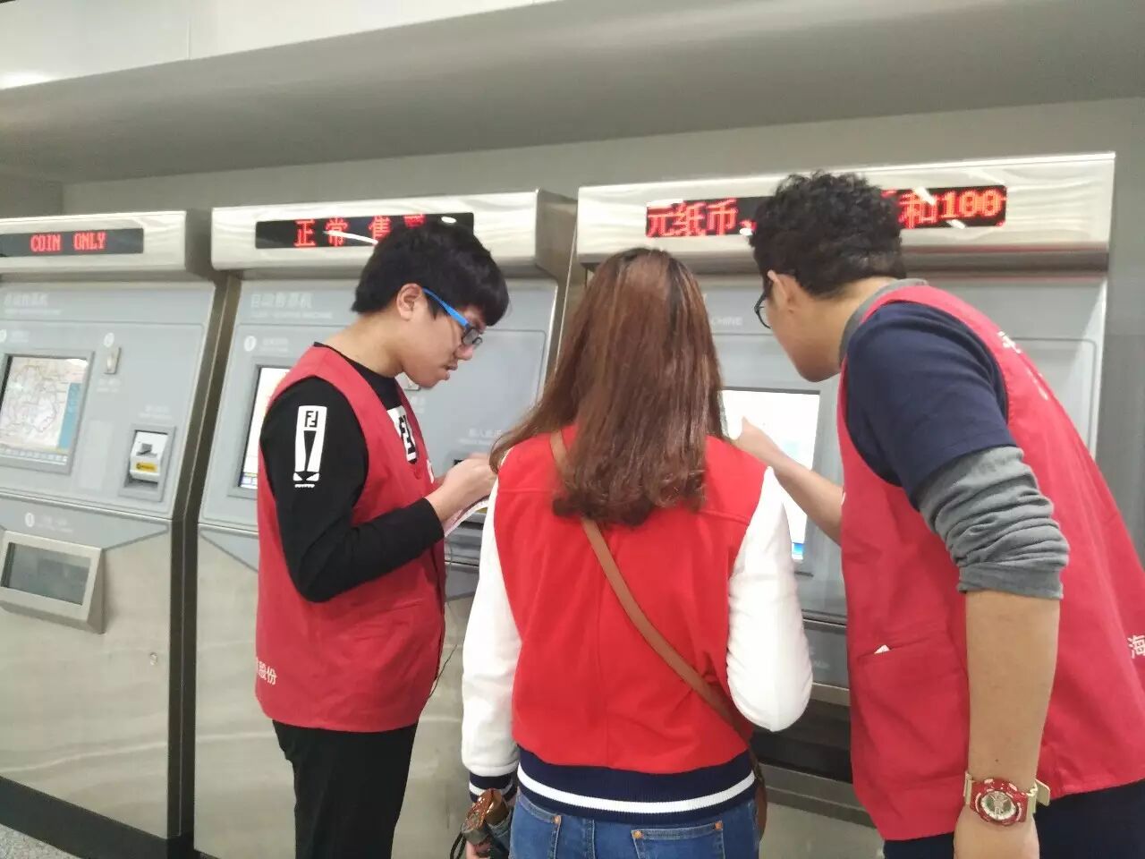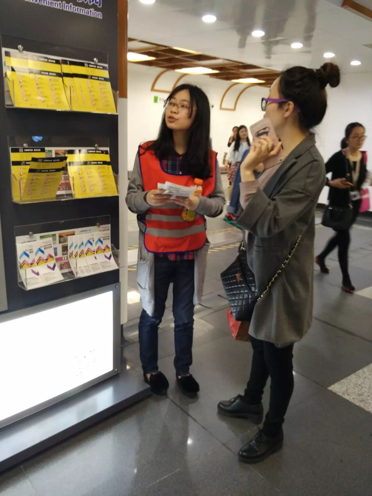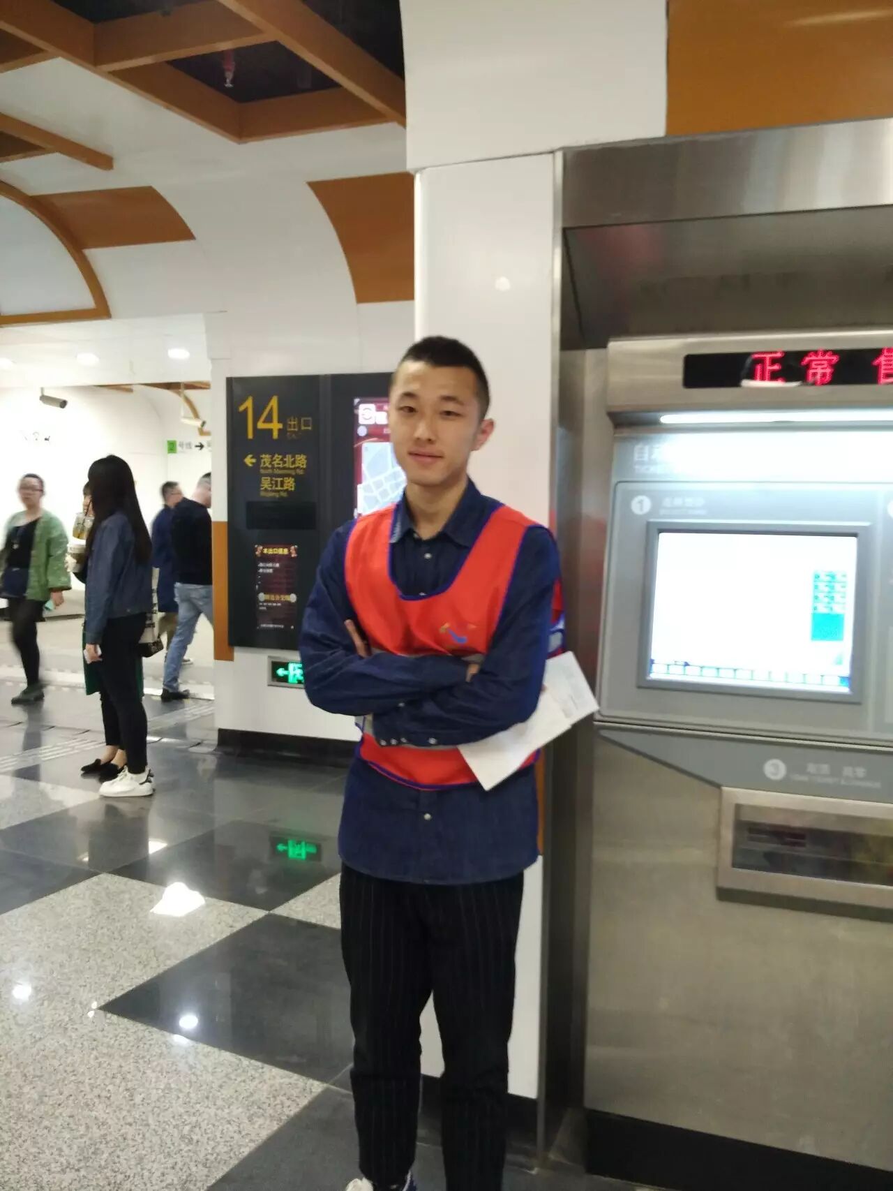 到达地铁站后,同学们换上工作服并从站长手中接过地图,随后由志愿者领队指导,被分配在各自岗位上,随时准备着为有困惑的行人释疑。最开始的一段时间,可能由于紧张,同学们的反应会有一些缓慢,甚至需要求助于领队。但是,在一段时间后,同学们渐渐习惯了环境,掌握了自己所处区域的周围和行人可能问出的问题,并能够对行人的提问做出快速的应答和应对,在用言语解释不清的情况下,同学们也会直接带领着行人走向正确的方向。