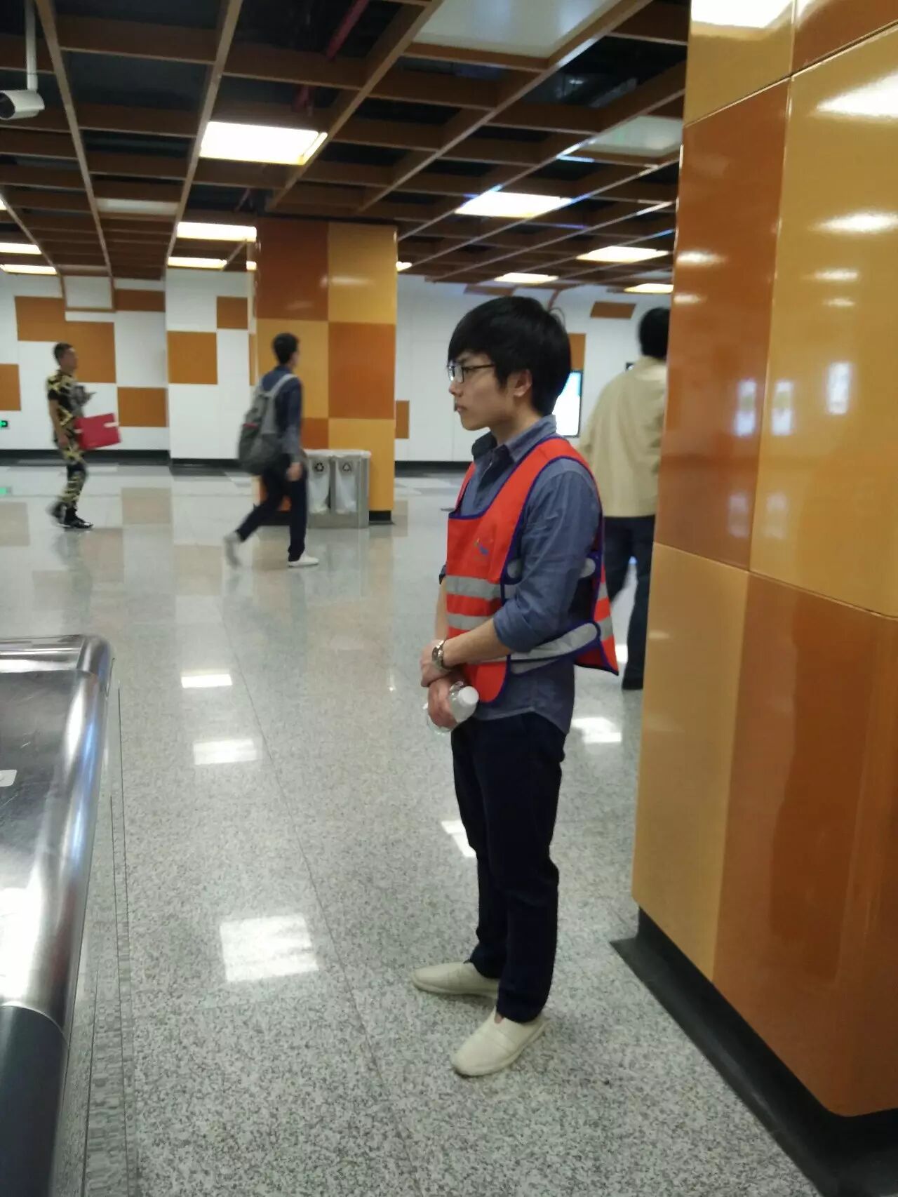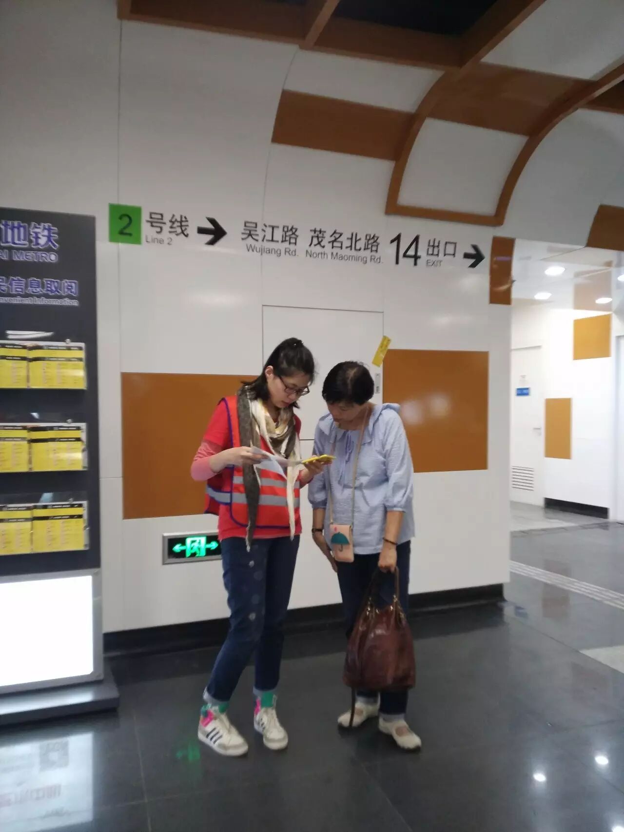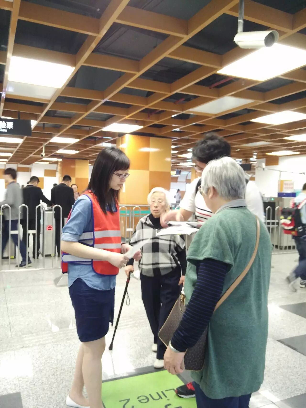 到达地铁站后,同学们换上工作服并从站长手中接过地图,随后由志愿者领队指导,被分配在各自岗位上,随时准备着为有困惑的行人释疑。最开始的一段时间,可能由于紧张,同学们的反应会有一些缓慢,甚至需要求助于领队。但是,在一段时间后,同学们渐渐习惯了环境,掌握了自己所处区域的周围和行人可能问出的问题,并能够对行人的提问做出快速的应答和应对,在用言语解释不清的情况下,同学们也会直接带领着行人走向正确的方向。