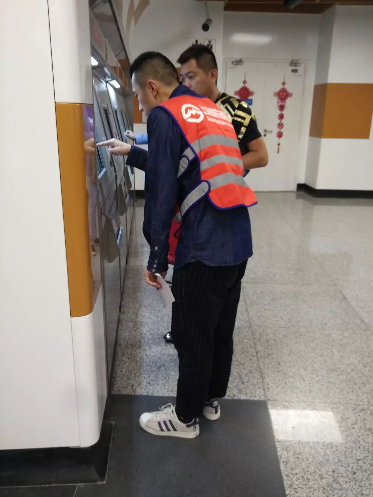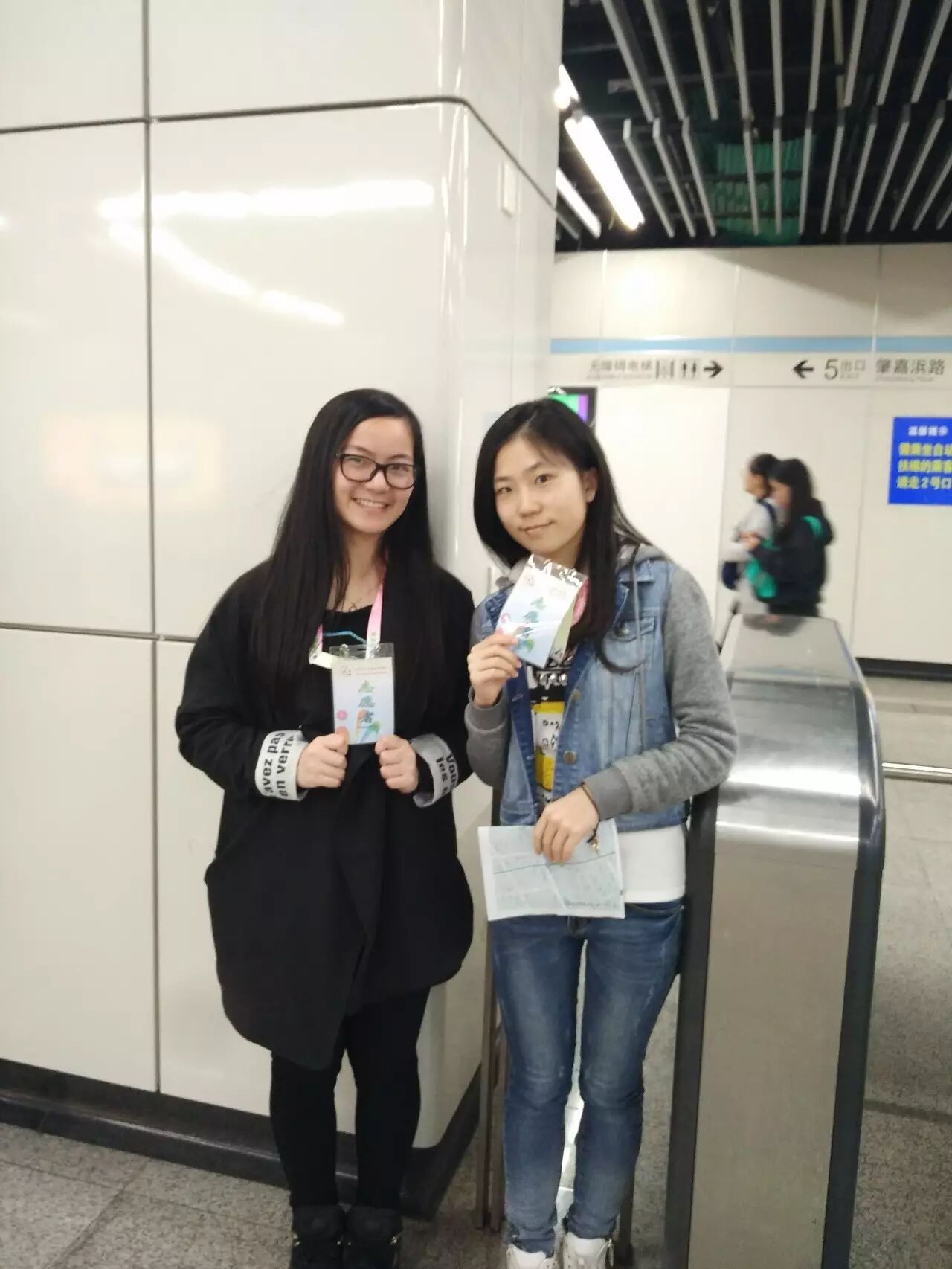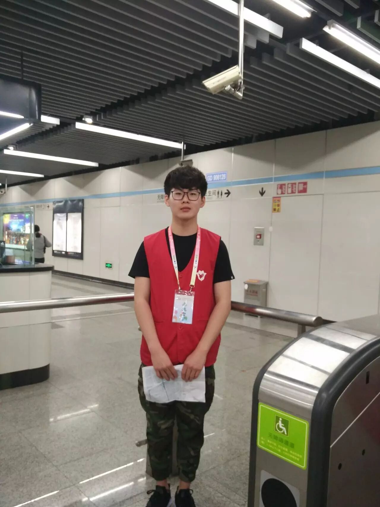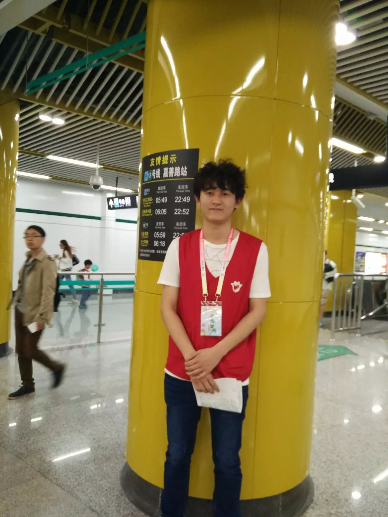 到达地铁站后,同学们换上工作服并从站长手中接过地图,随后由志愿者领队指导,被分配在各自岗位上,随时准备着为有困惑的行人释疑。最开始的一段时间,可能由于紧张,同学们的反应会有一些缓慢,甚至需要求助于领队。但是,在一段时间后,同学们渐渐习惯了环境,掌握了自己所处区域的周围和行人可能问出的问题,并能够对行人的提问做出快速的应答和应对,在用言语解释不清的情况下,同学们也会直接带领着行人走向正确的方向。