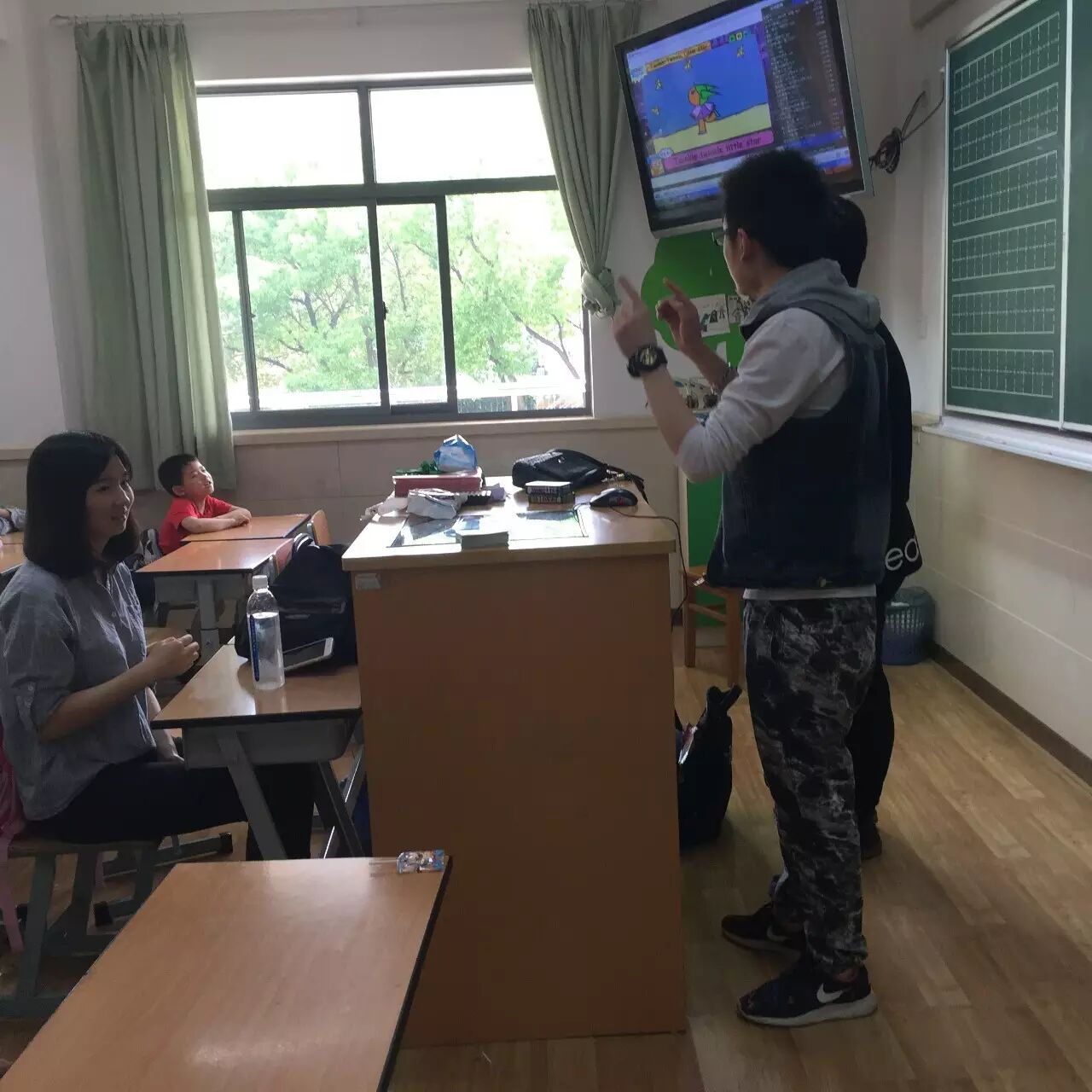志愿者与一(1)班的小同学们开始了一个多小时丰富多彩的课堂互动。活动共分为两个环节,第一部分英文歌曲教学,耳熟能详的歌谣《Little Star》一经旋律响起,原本嘈杂的教室立刻安静下来,在场的每一个人聆听着这温柔的旋律不经回到了年少时光;第二部分为猜词游戏,整个过程中志愿者们的绘声描述和小朋友的默契配合使得大家既玩得不亦乐乎,又增长了知识,学习了许多新的英文单词。