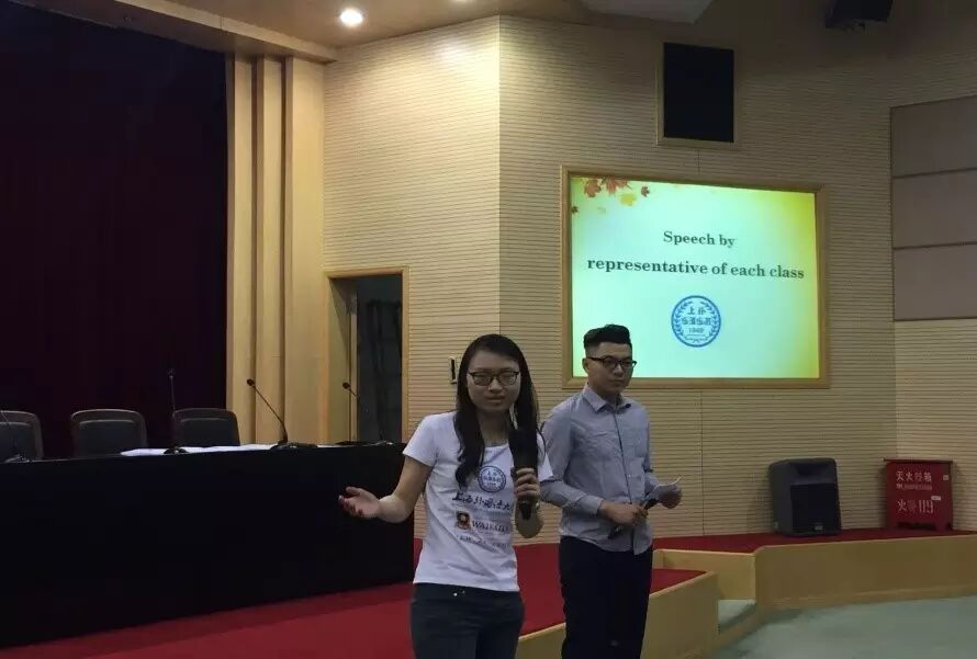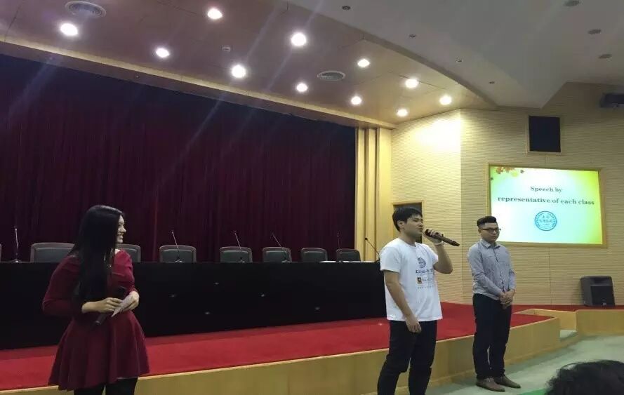 随后,各班代表石文君、吴嘉杰、赵宇涵、石佳琳和王维妙同学依次上台发表毕业感言。他们或沉稳、或诙谐、或略有羞涩。大家深情回忆了这两年来的学习和生活,以及作为一个新上外人一路走来的心路历程。在上外,他们不仅极大地提高了语言能力,也收获宝贵的友谊。对于很多远离家乡和父母的学生而言,遇到困难时,任课老师和辅导员的鼓励和信心,让他们备感温暖。